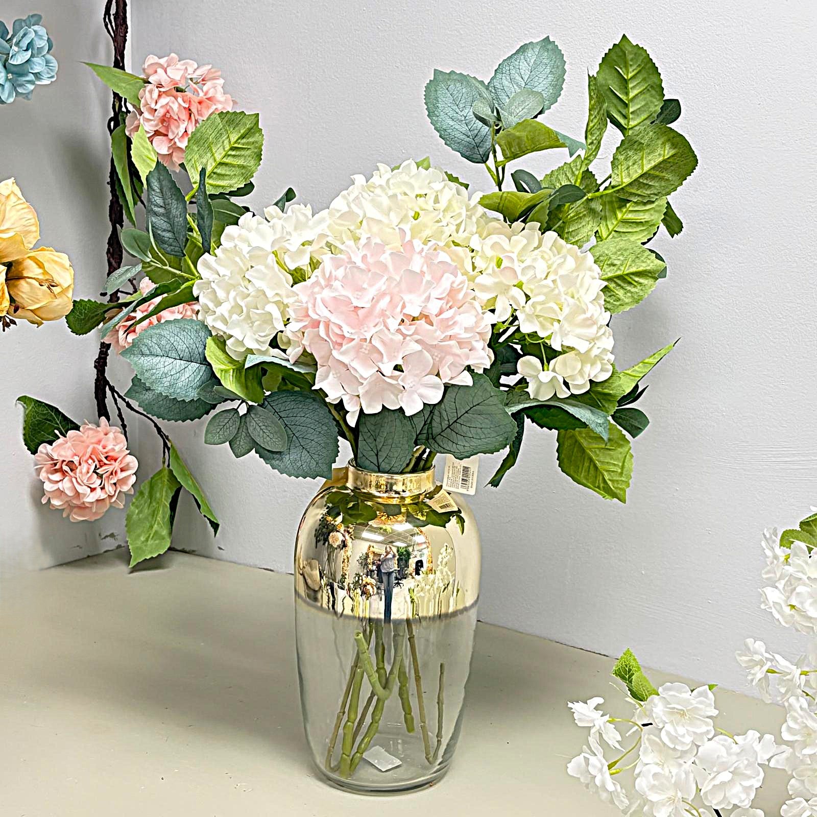This delicate artificial hydrangea stem features full, realistic blooms in Soft Blush Pink tone and White, bringing a touch of timeless elegance to any setting. . Its versatile color pairs beautifully with whites, creams, and muted pastels, enhancing both classic and modern décor styles.