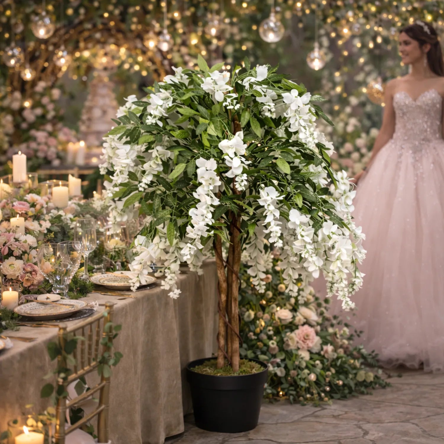 Moreover, the tree features cascading white wisteria blossoms paired with lush green foliage. As a result, it looks full, balanced, and visually soothing. At the same time, it requires no water, sunlight, or trimming, making it a stress-free décor solution.